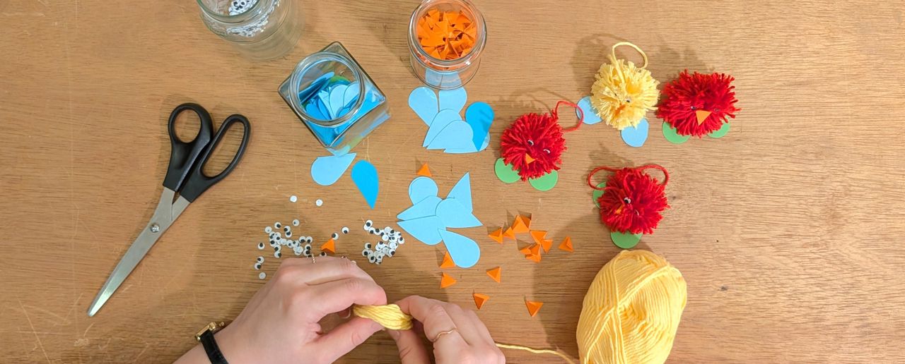Vi surrer, limer og klipper oss en liten påskevenn – bli med og lag en kylling av garn og papir!